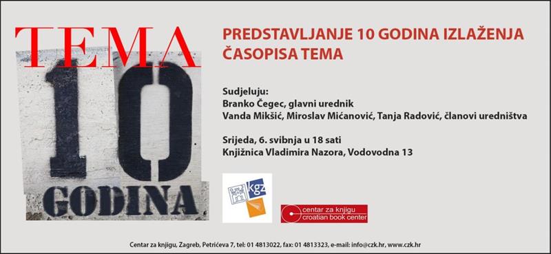 Rezime deset godina izlaženja časopisa za knjigu Tema (Zagreb, Centar za knjigu, 2004. - ) dao je 6. svibnja, na tribini u našoj knjižnici glavni urednik Branko Čegec te članovi uredništva - Vanda Mikšić, Miroslav Mićanović i Tanja Radović koji su razgovarali o problematici i temama koje su obilježile proteklo desetljeće izlaženja ovog časopisa.U izlozima Knjižnice izloženi su svi dosadašnji brojevi časopisa te fotografije nekolicine stalnih suradnika (Stanko Abadžić, Robert Ravnić, Jean de Breyne, Aleksandra Orlić) koje su časopisu dale osobiti vizualni identitet.