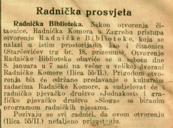 Radnička komora, u tadašnjim prostorima na Starčevićevom trgu 18, prizemlje (današnji Svačićev trg), otvorila je na korištenje svim radnicima "Radničku Čitaonicu".