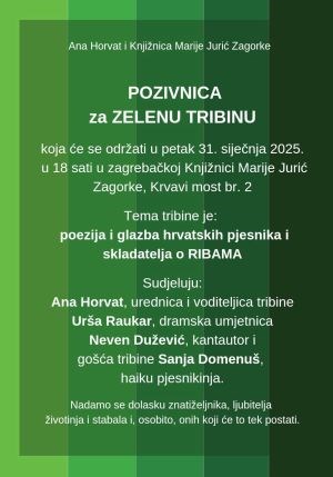 "Zelena tribina" je književni, poetsko-glazbeni susret s publikom koju zanima poezija i glazba o životinjama i stablima. Stalni izvođači tribine su urednica/voditeljica Ana Horvat, dramska umjetnica Urša Raukar i kantautor Neven Dužević, a na svakoj tribini nastupa i po jedan haiku pjesnik/pjesnikinja s desetak pjesama na temu tribine. Na "Zelenim tribinama" predstavlja se hrvatska poezija o životinjama i stablima/šumi uglavnom obuhvaćena panoramama hrvatskog pjesništva o životinjama i stablima sastavljačice Ane Horvat.