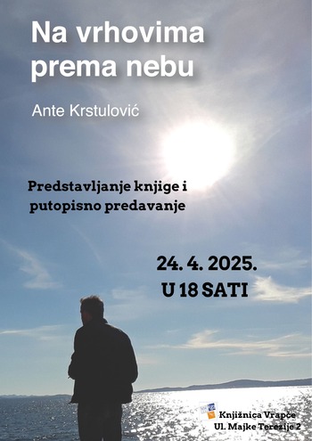 Pozivamo vas da 24. travnja 2025. u 18 sati posjetite Knjižnicu Vrapče i poslušate putopisno predavanje o prirodnim ljepotama Hrvatske. Ante Krstulović predstavit će svoju knjigu Na vrhovima prema nebu, koju opisuje kao „intimno putovanje kroz labirint uma i duše”, a Dinara, Mosor, Kozjak i Lastovo samo su neke od destinacija s kojima će nas upoznati. Pas Cvita vjerni mu je pratitelj na svakom putovanju.Ante Krstulović rođen je 1981. godine u Splitu. 2008. godine diplomirao je glumu na Akademiji dramske umjetnosti u Zagrebu.