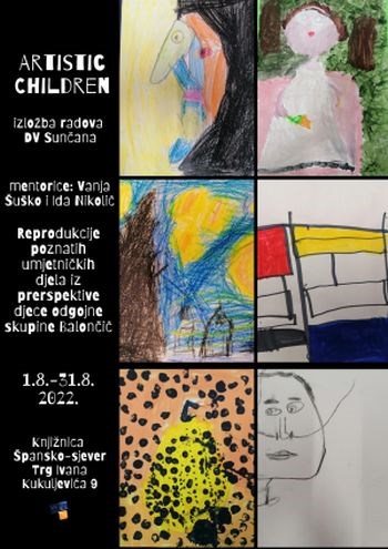 Izložba radova djece iz skupine s ranim učenjem engleskog jezika „Balončić“, iz Dječjeg vrtića Sunčana, pod mentorstvom odgojiteljica Vanje Šuško i Ide Nikolorić, nastala je u sklopu eTwinning projekta Artistic Children.Projekt je trajao 6mj. tijekom kojih su se djeca upoznavala s likovnim opusom raznih slikara. Razgovarali smo o zemljama iz kojih pojedini slikari dolaze, njihovoj kulturi i obilježjima. Metodom estetskog transfera djeca su prenijela doživljaj odabrane slike na papir, uživajući pritom u procesu miješanja boja kako bi dobila željenu boju. Izložbu Vlahe Bukovca posjetili smo u Galeriji Klovićevi dvori te na taj način zorno doživjeli njegova djela, što smo upotpunili sudjelovanjem na likovnoj radionici u organizaciji kustosice Galerije.