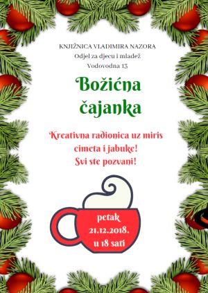 Pozivamo svu malu i veliku djecu da nam se pridruže na Božićnoj čajanki.U ovoj kreativnoj radionici, uz miris jabuke i cimeta, izrađivat ćemo božićne čestitke.