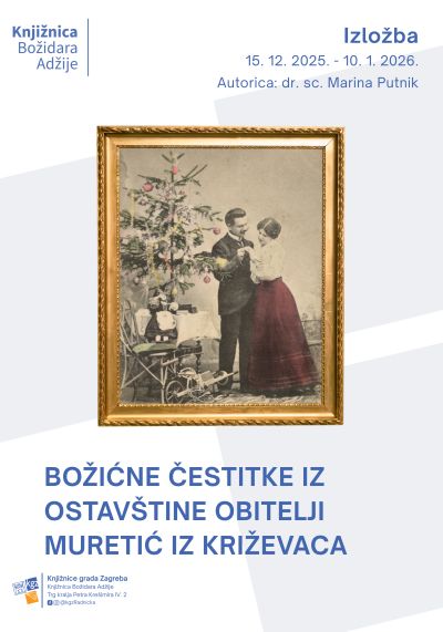 U Slobodnom pristupu Knjižnice Božidara Adžije postavljena je izložba Božićne čestitke iz ostavštine obitelji Muretić iz Križevaca.Prvom zabilježenom božićnom čestitkom smatra se ona koju je 1611. godine poslao njemački liječnik Michael Maier engleskom kralju Jamesu I. i njegovom sinu, princu od Walesa. Iako je Maier dirljivom čestitkom poželio kralju za Božić najveću sreću i radost, razmjena božićnih čestitki nije zaživjela još sljedećih 200 godina. Tako je prvi pokušaj masovne proizvodnje božićnih čestitki bio 1841. godine u Edinburgu, u Škotskoj. Te godine tiskara Charlesa Drummonda tiskala je čestitku s natpisom Compliments of the Season. Dvije godine kasnije, 1843., u Engleskoj se pojavila prva komercijalna božićna i novogodišnja čestitka. Za njezin nastanak zaslužan je litograf i tiskar Sir Henry Cole, britanski državni službenik i ljubitelj novih komunikacijskih formi. Želio je na praktičan način odgovoriti na brojne blagdanske poruke i čestitke. Stoga je, od prijatelja slikara Johna Callcotta Horsleya (1817. - 1903.), naručio ilustriranje i dizajniranje kartice s natpisom "A Merry Christmas and a Happy New Year to You". Horsley je ostao zapisan u povijesti kao dizajner prve božićne čestitke, Cole ih je dao izraditi i tiskati u oko 1000 primjeraka, a te su godine puštene u prodaju u Londonu i slale su se u omotnicama.