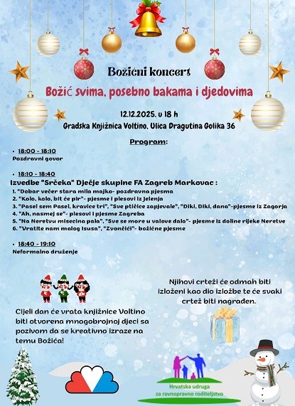 Božićni koncert „Božić svima“, posebno bakama i djedovima"Dječja skupina FA Zagreb Markovac „Srčeka“ izvest će: