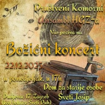 Društveni komorni ansambl Hrvatskog glazbenog zavoda održat će Božićni koncert u Domu za starije i nemoćne Sveti Josip, donoseći blagdansku glazbu kao znak pažnje, bliskosti i zajedništva. Ovaj koncert dio je društveno angažiranog djelovanja Hrvatskog glazbenog zavoda, kojim se glazba približava onima kojima je osobito potrebna, potvrđujući njezinu snagu da povezuje i oplemenjuje zajednicu!Program koncerta obuhvaća odabrana klasična djela, poznate i pjevne melodije te skladbe ugodnog i prepoznatljivog karaktera, prilagođene intimnoj atmosferi doma. Repertoar je osmišljen kako bi potaknuo emocionalnu povezanost, sjećanja i osjećaj bliskosti između izvođača i publike.