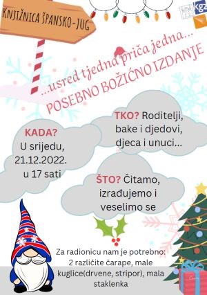 Posebno božićno izdanje pričaonice koja ujedno ovoga puta postaje i radionica božićnih ukrasa. Namijenjena je roditeljima i djeci.Za radionicu nam je potrebno: 2 različite čarape, male kuglice (drvene, stiropor…), mala staklenka.
