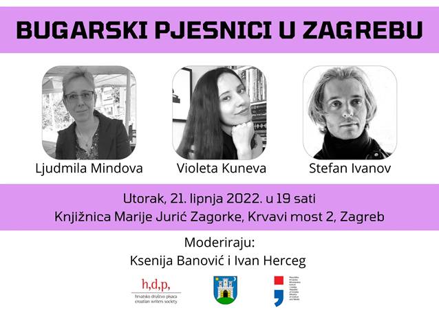 Nagrađivani bugarski pjesnici Ljudmila Mindova, Violeta Kuneva i Stefan Ivanov gostovat će u knjižnici, gdje će s njima razgovarati pjesnik i urednik Ivan Herceg i prevoditeljica Ksenija Banović.