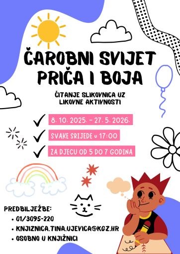 Zajedno ćemo putovati kroz priče o čarobnim mjestima, uzbudljivim avanturama i hrabrim junacima! Nakon čitanja slikovnica čekaju nas papiri, bojice i kistovi da svoje omiljene trenutke iz priče pretočimo u maštovite radove.Osim uživanja u pričama i kreativnom izražavanju, upoznat ćemo i nove prijatelje, poticati ljubav prema knjigama i stvarati naviku čitanja.