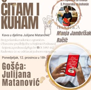 Na radionici Čitam i kuham Manje Jambrišak Račić, inspirirane njenim blogom (https://www.citamikuham.com/) govorit ćemo o knjigama Julijane Matanović uz nezaobilaznu kavu.Inspirirana knjigom I na početku i na kraju bijaše kava Manja je spravila desert. Knjiga je dostupna putem aplikacije ZakiBook.