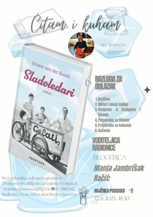 Blogerica Manja Jambrišak Račić pretočiti će dio atmosfere s bloga Čitam i kuham na radionicama u Knjižnici Podsused svakog prvog ponedjeljka u mjesecu. Razgovori o pročitanoj knjizi uz mirisan i slastan zalogaj, otkrivati će nam ulogu gastronomije u različitim kulturama.Sladoledari Ernesta van der Kwasta su ovaj put odabir za čitateljski izazov i inspiraciju Manje Jambrišak Račić. Pročitajte knjigu i predbilježite se za idući sastanak u Knjižnici. Zapratite istoimeni blog (https://www.citamikuham.com/).