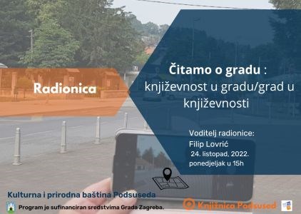 Cilj radionice je izraditi sadržaj za interaktivnu kartu kulturnog krajolika Podsuseda, korištenjem književnih tekstova u kojima se baštinski toponimi opisuju (Šenoa). Stvoreni materijal biti će dio interaktivne karte izrađene pomoću besplatnog softvera QGIS. Voditelj radionice Filip Lovrić dobiveni sadržaj implementirati će u izrađenu mapu.Interaktivna karta kulturnog krajolika Podsuseda zamišljena je kao svobuhvatna platforma za prezentaciju bogate kulturne i prirodne baštine ovoga kraja i sredstvo za komunikaciju baštine široj publici.
