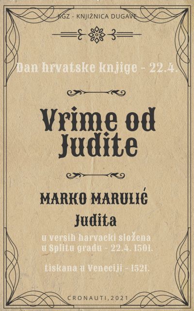 Cronauti vas pozivaju na putovanje u prošlost Hrvatske povodom 500 godina od tiskanja prve knjige na hrvatskom jeziku - Judite. Otkrijmo kakve su bile prilike i neprilike tadašnjeg života, tko je Judita, zašto je Marulić "složio" baš tu priču iz Staroga zavjeta na narodni jezik Hrvata. Potraži umjetnička djela hrvatskih i europskih majstora na temu Judite, pročitaj biblijsku pripovijest, pročitaj barem p o č e t n e stihove Marulićeve Judite, potraži suvremeni prepjev, usporedi riječi koje ti se čine zanimljivim, na kraju prezentacije napravi mali kviz: onaj tko bude najuspješniji neka dobije 5 iz zalaganja - a ti svakako unaprijed dogovori s profesorima nekoliko 5 - iz Hrvatskog, Povijesti i Likovnog - ili nam se samo pridruži na virtualnom putovanju u čast Marka Marulića i prve knjige "u versih harvacki složene u Splitu gradu" - 22.4.1501. Prezentaciju možete izraditi samostalno ili u grupi, pošaljite ju na e-mail: majda.bakic@gmail.com