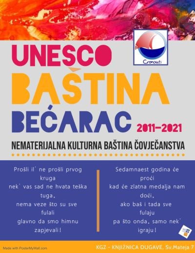 Proslavimo obljetnicu vrckastog bećarca koji je kao nematerijalna baština čovječanstva pod zaštitom UNESCO od 2011. Pridružite nam se u osmišljavanju stihova od kojih bi mogli napraviti lijepu bećarsku izložbu za Mjesec hrvatske knjige od 15. listopada do 15. studenog. Bećarce šaljite na adresu e-pošte: majda.bakic@gmail.com