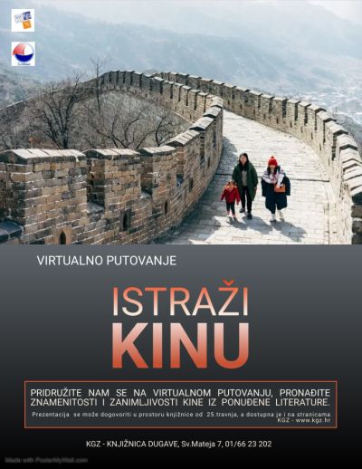 Cronauti vas pozivaju na predavanje o Kini koje će se održavati uživo u prostoru knjižnice po dogovoru, od ponedjeljka, 25.4. povodom produžene Noći knjige. Prezentacija je prikladna za niže i više razrede osnovne škole. Tko želi više istražiti tu veliku i zanimljivu zemlju može pronaći i posuditi literaturu koja će biti posebno izdvojena do kraja travnja u prostoru Odjela za djecu i mladež, kad završava i naše druženje s izložbom Zhaozhi Wanga: Fight Like a Tiger.