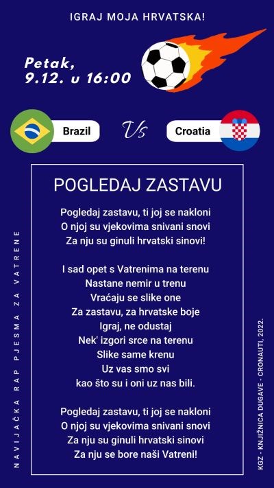 Jako nam se sviđa ovo apdejtanje utakmica hrvatske reprezentacija. Ponavljamo i poziv za pisanjem navijačkih pjesama, objavit ćemo ih na našim stranicama i poslati na adresu Hrvatskoj nogometnog saveza za Reprezentaciju. Idemo mi igrati, po mišljenju mnogih stručnjaka, s najboljom reprezentacijom svijeta! Ne može bolje. Igraj moja Hrvatska!
