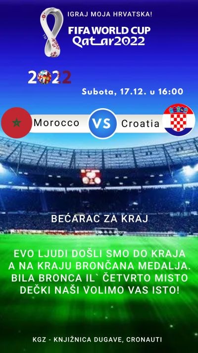 Evo ljudi došli smo do kraja, a na kraju brončana medalja. Bila bronca il' četvrto misto, dečki naši volimo vas isto! U subotu, 17.12. u 16:00 za treće mjesto na Svjetskom nogometnom prvenstvu 2022. igraju Hrvatska i Maroko! Svoje navijačke pjesme šaljite na adresu e - pošte: knjiznica.dugave@kgz.hr ili majda.bakic@gmail.com Igraj moja Hrvatska!