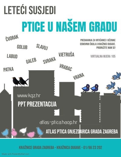 Nadahnuti izložbom Svijet ptica pripremili smo vam ppt prezentaciju Leteći susjedi u kojoj možete pronači osnovne informacije o nekim vrstama ptica gnjezdarica u našem gradu, Za naše leteće susjede koristili smo Atlas ptica gnjezdarica grada Zagreba na stranicama Ministarstva gospodarstva i održivog razvoja, a za općenite zanimljivosti iz svijeta ptica koristili smo razne internetske stranice čiji popis možete pronaći u prezentaciji. Prezentacija se može koristiti virtualno kao i u prostoru knjižnice uz predhodni dogovor. Može se prilagoditi starijim vrtićancima kao i školarcima svih uzrasta, ipak najprikladnija je za učenike nižih razreda osnovne škole. Pridružite nam se!