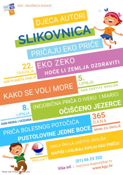 Potražite slikovnice s ekološkom temom čiji su autori učenici nižih i viših razreda osnovne škole nagrađivani na natječaju Moja prva knjiga. Nadahni se njima, kao i drugim knjigama iste tematike koje ćeš pronaći u prezentaciji Na primjer, i pridruži nam se u stvaranju čišćeg i zdravijeg okoliša za sva bića s kojima dijelimo mjesto zbivanja - zapiši svoje misli, osmisli konkretne akcije, pretoči svoje ideje u riječi i/ili slike, u slikovnice i sl. Pruži dobar primjer svim nesavjesnim odraslima koji zagađuju okoliš!