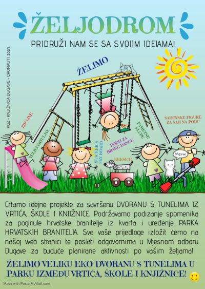 U proteklom mjesecu tražili smo Atlantidu u knjizi Carla i Renza Piana. Ta nas je potraga nadahnula za otvaranjem Željodroma na kojem bismo crtali arhitektonske projekte za naš kvart. Manji dio skica izložen je u prostoru knjižnice, a veći će dio biti izložen na virtualnoj galeriji na našoj web stranici. Sve ćemo vaše projekte poslati na adresu Mjesnog odbora Dugave, možda koji uspijemo i realizirati, jednom. Na izložbi možete vidjeti i buduću lokaciju Parka Hrvatskih branitelja gdje će se podići spomenik poginulim hrvatskim braniteljima s područja Dugava. Pozivamo vas da nam se pridružite i iz drugih kvartova sa svojim idejama, svoje skice šaljete na adresu elektoničke pošte: knjiznica.dugave@kgz.hr ili majda.bakic@gmail.com