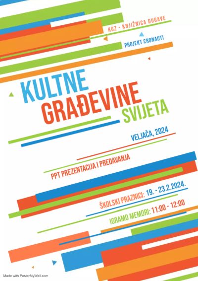 Pozivamo vas na predavanje Kultne građevine svijeta koje je nastalo na temelju memori igre Iconic Buildings of the World, Printworks. Prezentacija je postavljena u pdf formatu uz zanimljive video priloge s YouTube kanalakoje možete gledati kod kuće i podijeiti stara i nova znanja sa svojim najbližima. Predavanja su prikladna za učenike od trećeg do osmog razreda osnovne. U periodu zimskih praznika od ponedjeljka, 19.2. do petka 23.2. u periodu od 11:00 - 12:00 sati, organiziramo igraonice s memori kartama u kojoj se traži spajanje kultne građevine i grada u kojoj se ista nalazi. Pridružite nam se!