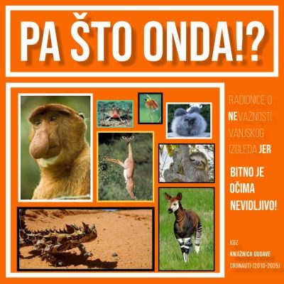 Pozivamo vas na radionice na kojima razmišljamo o (ne)važnosti vanjskog izgleda preko prezentacije životinja neobičnog izgleda i njihovih zamišljenih poruka. U drugom dijelu radionice stvaramo svoje životinje i šaljemo poruke. Radimo na novoj prezentaciji, a do tada pogledajte staru kao i likovne radove nastale na dosadašnjim radionicama Pa što onda!? Radionica je prikladna za učenike nižih razreda osnovnih škola, iznimno se može prilagoditi i za starije vrtićance. Pridružite nam se!