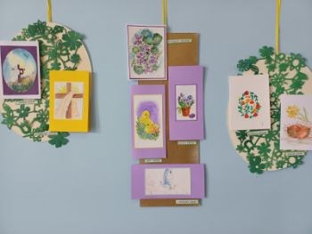 Izložba uskrsnih aranžmana Ingeborg Crnogaj i uskrsnih čestitki nastalih u sklopu radionica Zaklade Zajednički put i Gerontološkogcentra Trešnjevka.