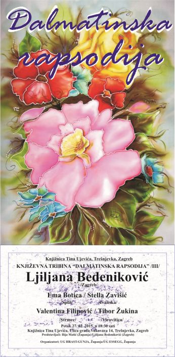 Promocija pete zbirke poezije "Skretnice", Ljiljane Bedeniković, uz predstavljanje i mladih autora izvan Zagreba (Ema Botica - Split, Stellla Zavišić - Ivanska, Valentina Filipović - Strmec, Tibor Žukina - Virovitica).http://www.kgz.hr/default.aspx?id=9434