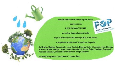 Povodom Dana planeta Zemlje i u suradnji s Međunarodnom mrežom Poets of the Planet u našoj će se knjižnici održati pjesničko čitanje. Sudjeluju Bogdan Arnautović, Lana Derkač, Biserka Goleš Glasnović, Ivan Herceg, Miroslav Kirin, Marija Lamot, Sonja Manojlović, Davor Šalat, Tomislav Šovagović, Kristina Špiranec, Marina Šur Puhlovski i Sonja Zubović. Program će voditi Lana Derkač i Davor Šalat.