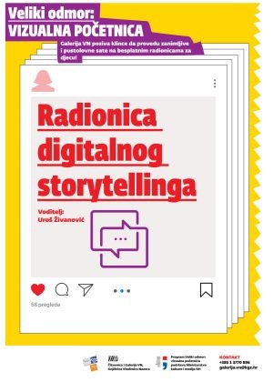 U Galeriji VN počinje radionica digitalnog storytellinga koju vodi Uroš Živanović!Cilj radionice je poticanje medijske pismenosti, emocionalne zrelosti te kreiranja vlastitih efektnih priča na zanimljiv i zabavan način u suvremenom medijskom prostoru (na društvenim mrežama poput Snapchata, Tik-Toka, Twittera i Facebooka).