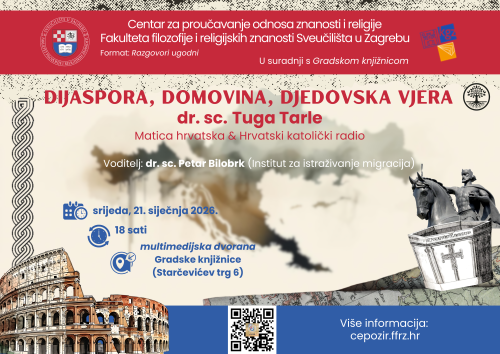 Predavanje organizira Centar za proučavanje odnosa znanosti i religije Fakulteta filozofije i religijskih znanosti Sveučilišta u Zagrebu Jordanovac 110, pp 169, HR-10000 Zagreb, https://cepozir.ffrz.hr/, u suradnji s Gradskom knjižnicom kao dio Serije javnih događaja Vjera i razum: 3. akademski razgovori.
