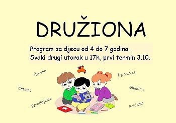 Dragi roditelji, draga djeco!S veseljem vas pozivamo da se pridružite našem novom kontinuiranom programu za djecu "Družiona". Osim čitanja slikovnica, program uključuje i razne druge radionice.