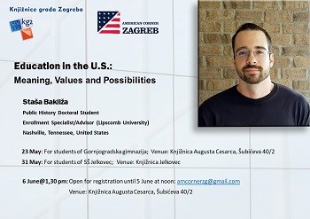 Staša Bakliža, a public history doctoral student and an enrollment specialist/advisor (Lipscomb University) will talk about his educational experience both in and out of Croatia.In the U.S., just like anywhere else in the world, education is one of the most important stages in human life and development. In his interactive presentations Staša Bakliža will discuss how U.S. school programs (college and university) at large aim to promote interaction, individual expression, teamwork, and critical thinking amongst students. Students are expected to learn from each other, and customize their own learning experience through engagement in school research projects, organization of student clubs and student boards, and inclusion in cultural, art and sport activities. The purpose of such administrative support that the schools provide is to help students grow into independent, self-resourceful and confident individuals, with abilities to bring new ideas and solutions to the society and job industry.