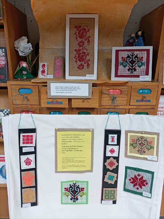 Svaki profesor matematike cijeli svoj radni vijek pokušava odgovoriti na pitanja (nekih) svojih učenika: "Što će mi to u životu?" Svaki pravi profesor dokazuje svojim učenicima da je MATEMATIKA SVUDA OKO NAS.Prof. savjetnik Katarina Hrgović nastavnica je matematike u OŠ Brestje. Ovo je već druga izložba koju je ustupila našoj knjižnici, a prikazuje kako učenici kroz ručni rad uče geometrijske pojmove kao što su centralna i osna simetrija te translacija. Motive su prikupljali proučavajući narodne nošnje naše lijepe Hrvatske, a potom ih preslikali na papir i otkrili o kojoj se vrsti simetrije radi. Potom su ih preslikavali na platnu tehnikama križića ili crtica. Tako su nastali ukrasni magnetići te radovi malo većeg formata koji se sada mogu razgledati u prostoru naše knjižnice.