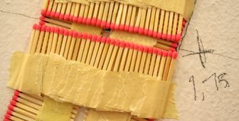 'Our Sun's Evolution, as a Bubble' is a temporary site-specific installation/performance/wall drawing. I make a pencil line drawing on a large white wall in the gallery, then attach matches on this drawing so that the heads of the matches follow the lines. Once the installation is complete, I ignite the work and allow the chain reaction to take place. The resulting wall drawing remains in the space until the end of the exhibition.