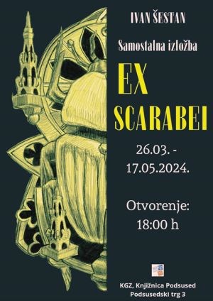 Priča koju donosi izložba mladog slikara Ivana Šestana progovara Ex Scarabei, odnosno iz skarabeja, lika kukca kornjaša koji se postavlja kao simboličan protagonist cijele izložbe. Prvo samostalno predstavljanje radova Šestana osvit je njegovog obećavajućeg umjetničkog razvitka. Smješten na, za njega karakterističnoj, crnoj pozadini, centralna figurativna točka je lik kukca protkan simboličkim značenjem.Skarabej je postavljen u kompozicijsko središte oko čije se okomite osi simetrično preslikavaju lijeva i desna strana rada. Kukčeva sjajna ljuštura presijava se otmjenim premazom, ostavljajući dojam profinjene politure. Oko figure tijela, kao nositelja težine značaja, gravitiraju naizgled pripadni udovi, koji su prožeti uresima i lebdećom arhitekturom, zajedno tvoreći auru filigranske primjesi koja ujedno uranja i iskače iz crne pozadine, stvarajući titravi dojam žive dvojbe pretvara li se sve u apstrakciju ili iz nje, oformljujući se, izvire.