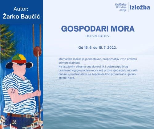 Izložba autora Žarka Baučića predstavlja likovne radove kojima je u fokusu mornarska majica, jednostavan, prepoznatljiv i vrlo efektan primorski atribut.Na izloženim slikama ona donosi lik i pojam prpošnog i dominantnog gospodara mora koji priziva sjećanja iz morskih dubina i prostranstava sa željom da kod promatrača ujedno stvori i nova.