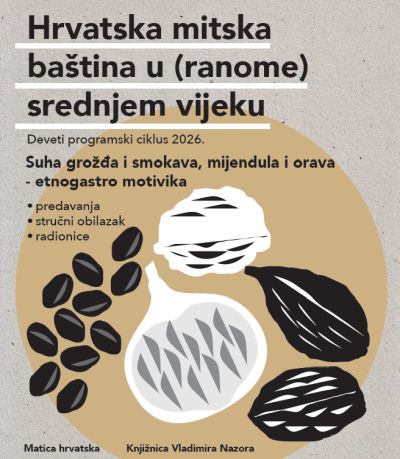 Prema ideji i na poticaj Lidije Bajuk, znanstvene suradnice u Institutu za etnologiju i folkloristiku i pročelnice Odjela za etnologiju i arheologiju Matice hrvatske, Matica hrvatska i Knjižnica Vladimira Nazora od 2018. surađuju na projektu Hrvatska mitska baština u (ranome) srednjem vijeku.Deveti programski ciklus Suha grožđa i smokava, mjendula i orava - etnogastronomska motivika (2026.) ovoga popularno-znanstvenog projekta nastavlja se na prvi tematski ciklus Stablo svijeta (2018.), drugi Mitska simbolika boja (2019.), treći Izvir-voda izvirala (2020.), četvrti Bestijarij - Da bi imel perje (2021.), peti Herbarij - Izresla ruža rumena (2022.), šesti Sunce, Mesec i te drobne zvezdice (2023.), sedmi Igra kolo u dvadeset i dva - mitska simbolika brojeva (2024.) i Senjico senjala - mitska simbolika snova (2025.) obuhvaćajući interdisciplinarne znanstveno-stručne i umjetničke istraživačke dosege te kreativne radioničke interpretacije mitske baštine na hrvatskim područjima od (pret)kršćanstva do danas.
