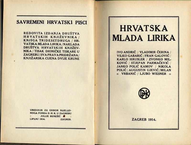 Stogodišnja pjesnička dama Hrvatska mlada lirika može se podičiti da je ušla u drugo stoljeće postojanja. Kakva joj je bila književna kob? Bibliografiju izložbe pogledajte na katalogu.Oživjela je 1914. u osvit Prvog svjetskog rata zahvaljujući izdanju Društva hrvatskih književnika, a uredio ju je Julije Benešić. Autor uvoda je Ljubo Wiesner koji kaže da knjiga nema pretenziju biti antologijom, nego da je to pregled najmlađe hrvatske lirike. U knjizi je zastupljeno dvanaest pjesnika: Ivo Andrić (6 pjesama), Vladimir Čerina (6 pjesama), Vilko Gabarić (11 pjesama), Fran Galović (9 pjesama), Karlo Hausler (10 pjesama), Zvonko Milković (6 pjesama), Stjepan Parmačević (12 pjesama), Janko Polić-Kamov (5 pjesama), Nikola Polić (7 pjesama), Augustin Ujević (11 pjesama), Milan Vrbanić (2 pjesme) i Ljubo Wiesner (5 pjesama). Izbor pjesama složen je u dogovoru s pjesnicima koji su po volji birali svoje pjesme i odredili im broj. Pjesme Janka Polića Kamova izabrao je Vladimir Čerina, stoji u napomeni na kraju knjige. Biografije pjesnika sastavljene su nekonveniconalno, a potpisuje ih također Wiesner.