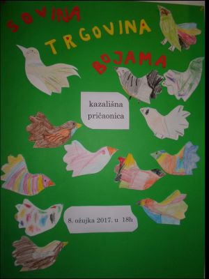U današnjoj pričaonici nastavljamo s pripremema igrokaza Sovina trgovina bojama prema istoimenom igrokazu Sanje Lovrenčić. U prethodnoj likovnoj radionici izradili smo plakat s mobilnim plošnim papirnatim pticama koje će nam poslužiti kao lutke u igrokazu.