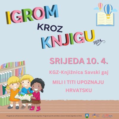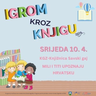 Predstavljanje hrvatsko-španjolske slikovnice Mili i Titi upoznaju Hrvatsku.Na predstavljanju slikovnice sudjelovat će autori Camila Docampo i Matija Jerković te predstavnici Izdavačke kuće Srednja Europa. Nakon čitanja priče, djeca će moći potražiti na Globusu i zemljopisnoj karti Argentinu i Hrvatsku, crtati, naučiti nekoliko riječi španjolskog i još puno toga drugog, a sve to uz igru i zabavu.