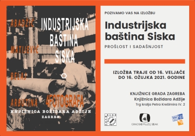Izložba „Industrijska baština Siska – prošlost i sadašnjost“ postavljena je u prostoru Knjižnice Božidara Adžije od 16. veljače do 16. ožujka 2021. u suradnji s Gradskim muzejom Sisak i fotogalerijom „Siscia Obscura“.Autor izložbe Vlatko Čakširan, ravnatelj Gradskog muzeja Sisak i četiri fotografa – Stanko Abadžić, Damir Matijević, Janko Belaj i Miroslav Arbutina, predstavili su industrijsku baštinu grada. Ovi vrhunski fotografi, od kojih je svaki do sada ostvario svoj osobni stil fotografiranja, stavljeni su u jedno sasvim novo okruženje, njima nepoznato, u kojem su primijenili svoj prepoznatljiv fotografski rukopis ocrtavajući na plakatima i fotografijama povijesnu priču.