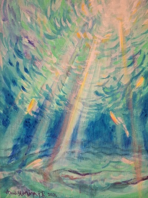 Izložba slika Anastazije Peraić Raguž, ciklus inspiriran simbolikom plave boje kao boje transcedencije. Slike su nastale u u kombinaciji nekoliko tehnika ( akril na platnu, slika i crtež ugljenom, te neke kombinacije sa recikliranim materijalima).Anastazija Peraić Raguž je rođena u Splitu 1969. godine. Na Akademiji likovnih umjetnosti diplomirala je grafiku klasi prof. Zdravka Tišljara 1998. god. Bavila se grafičkim dizajnom, radila je u izdavačkoj kući Hrvatsko Slovo i bila je članica Zajednice samostalnih umjetnika od 2003.do 2014. godine. U više navrata vodila je različite likovne radionice i projekte uz rad u osnovnoj školi. Trenutno je zaposlena u Obrtničko i industrijsko graditeljskoj školi u Zagrebu.