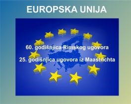 Ove se godine navršavaju dvije značajne obljetnice Europske unije: 60. obljetnica potpisivanja Rimskih ugovora kojima su osnovane Europska ekonomska zajednica (EEZ) i Europska zajednica za atomsku energiju (Euratom) i Ugovor o Europskoj uniji (EU) poznatiji kao Ugovor iz Maastrichta koji je potpisan 1992., a stupio na snagu 1. siječnja 1993. godine.Europska ekonomska zajednica ustanovljena je kao carinska unija među državama potpisnicama: Belgijom, Francuskom, Italijom, Luksemburgom, Nizozemskom i Njemačkom i postavljeni su kriteriji i temeljni ciljevi stvaranja zajedničkog tržišta za slobodno kretanje ljudi, roba, usluga i kapitala. Europska zajednica za atomsku energiju postavila je za ciljeve razvoj istraživanja nuklearne energije i njezine upotrebe u civilne svrhe.