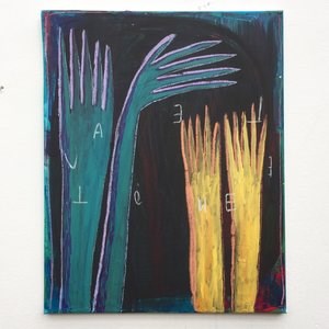 Gomilanje predimenzioniranih figura bez lica, bez persone u osobi, u zasebnu kompoziciju samo je borba protiv stvaranja koncepta. Svaka naslikana figura uvijek kao da žudi popuniti svaki međuprostor svog bića, ali zbog potisnute nervoze sva njena sadržajnost se razbija različitim znakovima, linijama, poljima boje, crticama – izlomljenim i kontinuiranim – i rukama. Nesvjesni smo koliko su ruke elementaran dio identiteta. Ruke postaju arhetip radnje, pokreta i sadržajnosti bića unutar kolektivne i osobne ličnosti. Prije radnje postoji odluka i onda postoji materijalizacija odluke, a ruke su u svakom od tih slučaja točno između.