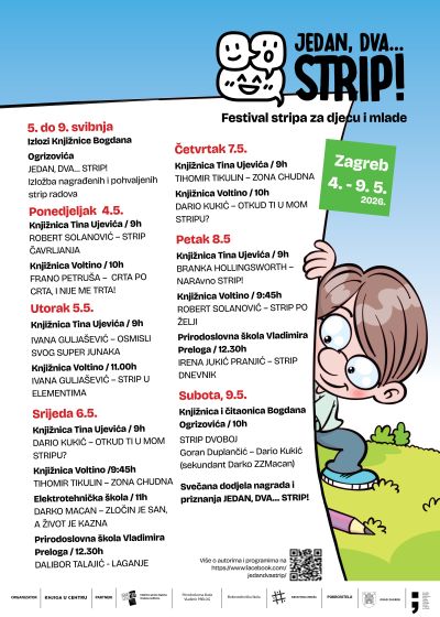 Radionice organizirane u suradnji sa školama održavati će se u Zagrebu, Rijeci i Ogulinu, a 9.10. u Knjižnici Bogdana Ogrizovića u Zagrebu bit će dvoboj u crtanju, proglašenje nagrađenih stripova i radionica crtanja otvorena za sve!U Knjižnici Voltino od 4. do 9.5.2026. radionice će učenicima OŠ Voltino održati strip crtači Frano Petruša, Ivana Guljašević, Tihomir Tikulin, Dario Kukić i Robert Solanović.