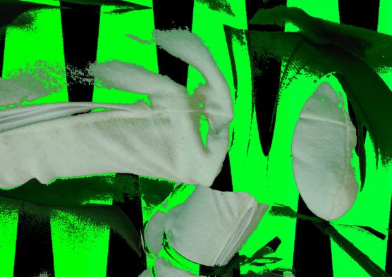 Gledam u titrave artefakte, u glitchanje piksela koje nastaje kompresijom. U vremenskom slijedu video codec sažima podatke kako bi nam učinio sliku brže vidljivom, međutim prevelikom količinom kompresije različitih boja nastaje glitch - čineći samu tehnologiju sabijanja slike vidljivom. Vidim Nominis, prisutnu kroz video na nekoliko anakronih monitora formata 4:3, međutim primjećujem da je slika formata 16:9. Ovaj crni obrub pri vrhu i dnu slike na monitorima koje više ne koristimo, osjećam kao trag vremenskih preklapanja. Rubovi crne plastike prefarbani su u zelenu koja se preklapa i spaja sa zelenom tkanine na podu na kojem se monitori nalaze. Gledam u zelenu i green screen platno. Zelena chroma key compositing - postprodukcijske tehnologije kojom ćemo nešto što nalazimo ispred nečeg naći ispred nečeg sasvim drugog jednostavnim odvajanjem boja na video slici. Odvajamo baš zelenu jer je najmanje nalazimo na ljudskoj koži. Nominis svoju kožu prekriva drugom, kožom skrojene od još jednog od opipljivih materijala prenesenih iz umjetničina studija u prostor galerije. Gledam u preklapanje prostora i tijela u videu. Zelena zatitra i pobijeli. Zeleni predmeti zatitraju i pobijele spajajući se s pozadinom. Meka tkanina sada je od oštrih i šiljastih rubova, podsjećajući na staklo čija se prozirnost gubi u slaboj rezoluciji. Prošećem se po prostoriji i među smotuljcima bijele i zelene tkanine vidim alat kojim Nominis razbija ove staklene glitch planine s videa: Čekić je, kao i Nominis, umotan u drugu kožu. To je čekić u dragu.(iz teksta Marka Gutića Mižimakova)