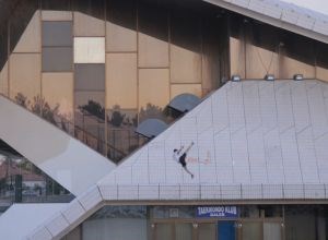 No, u kontekstu suvremenih umjetničkih praksi, sport tek rijetko biva tematiziran, izmiče im ne toliko svojom postavkom, koliko unaprijed definiranim čitanjem. Iako bi bilo zanimljivo istražiti njihove dodirne točke – i umjetnost i sport uključuju opsesivne i izložbene (prezentacijske) elemente, ideološke i estetske – čini se kako sport, kao fenomen, nije dovoljno zanimljiv umjetničkim obradama. Stoga, “Korak za Koteks”, dvokanalna video instalacija multimedijalne umjetnice Katerine Dude, predstavlja pomak u pristupu i tretiranju problematike sportsko-prodajnog kompleksa Gripe-Koteks (Split). Događa se obrat: sport, napose rekreativni, ulazi u fokus umjetničkog rada, odnosno zauzima ravnopravnu poziciju s temom arhitekture, pokušavajući predstaviti afirmativni emancipatorski aspekt rekreativnog sporta, ali i sporta općenito. Pritom temu ne idealizira, već usmjerivši se na site specific odnos Split – sport – Koteks, istražuje relacije koje ga premrežuju.