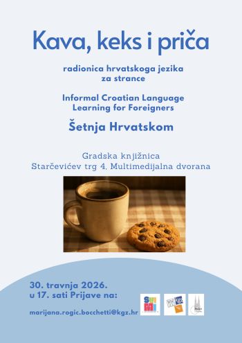 Šetnja HrvatskomPozivamo vas na radionicu i učenje hrvatskog jezika u neformalnom obliku - uz keks, kavu, čaj ili sok! Radionice su namijenjene svima koji na neformalan način u opuštenoj i ugodnoj atmosferi žele naučiti ili pojačati znanje hrvatskog jezika. Molimo da se za radionicu OBAVEZNO unaprijed prijavite!