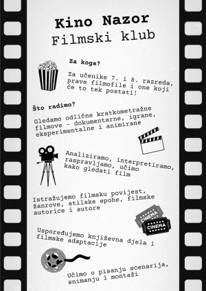 Na Odjelu za djecu i mladež Knjižnice Vladimira Nazora ove jeseni započinjemo s novim, filmskim programom, Kino Nazor, posvećenim razvoju filmske kulture i filmske pismenosti.Središnji je dio programa Filmski klub, namijenjen učenicima 7. i 8. razreda. Filmski klub mjesto je na kojem se gledaju birani naslovi kratkog metra - igrani, dokumentarni, animirani i eksperimentalni, od domaćih klasika do suvremenih nagrađivanih festivalskih uspješnica. Kroz analizu i interpretaciju učit ćemo kako gledati film, kako prepoznati filmska izražajna sredstva i kako izgrađivati vještine baratanja filmskim jezikom.
