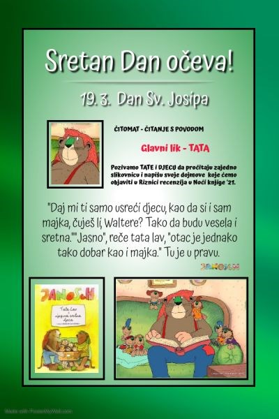 Novo čitanje s povodom posvećeno je očevima za njihov dan koji se slavi 19.3. na Dan Sv.Josipa, zaštitnika Hrvatske odlukom Hrvatskog sabora iz 1687. Za poklon predlažemo slikovnice s TATOM kao glavnim likom i zajedničko čitanje s djecom. Poslije čitanja napišite dojmove, kritičke osvrte, odnosno recenzije slikovnica i pošaljite ih na e-mail: majda.bakic@gmail.com ili ih donesite u rukopisu u knjižnicu. Recenzije će biti objavljene u Riznici recenzija u Noći knjige, 23.4.